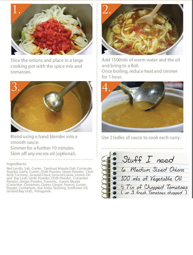 Make a batch of golden, restaurant style Curry sauce with our delicious spice mix, blended to create an authentic curry taste every time. Each Box contains enough spice mix to make sauce for 10 + Curries. Just add this spice to onions and tomatoes and simmer... then blend to make that universal sauce which is the perfect base for all your curries.
