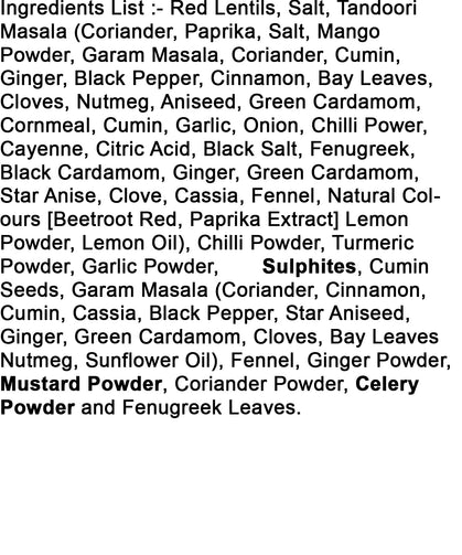 Foil packed to ensure optimal freshness. Each pack contains enough spices and Lentils to make 4 servings