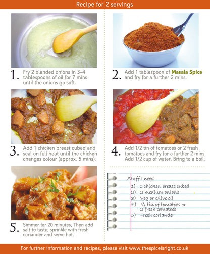 Our Masala Curry Kit produces a rich sauce which is mild in terms of heat, hotter than a Korma, yet milder than a Madras. Although this curry is mild, it is loaded with various other spices which create a mouth watering dish full of flavour without the overpowering of chilli.