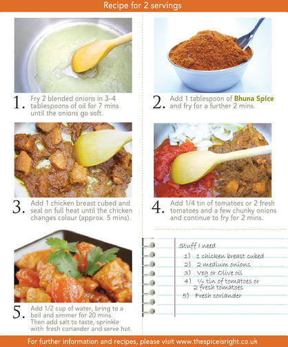 A tantalising combination of tomatoes and chunky onions creates a dish exploding with flavours and textures. This 'Curry Kit' consists of freshly ground and packed 'Bhuna Spice'.